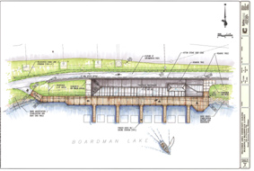 Construction of the boathouse is complete and we want to thank you! Our long held goal of having a permanent storage facility on Boardman Lake is now a reality! Our new boathouse was dedicated as the Gordon & Jean Cornwell Sailing Center.